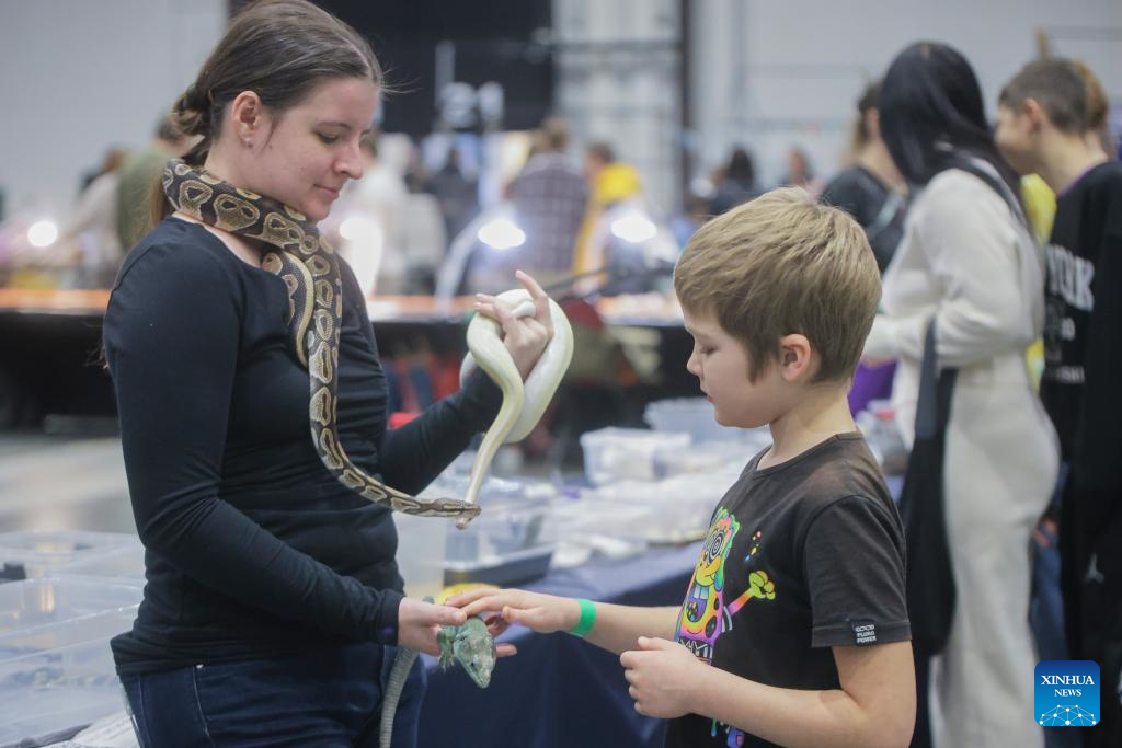 A boy touches a reptile at the 2025 Pet Show in St. Petersburg, Russia, Dec. 14, 2025. The event brings together over 3,000 dogs and 800 cats. (Photo by Irina Motina/Xinhua)