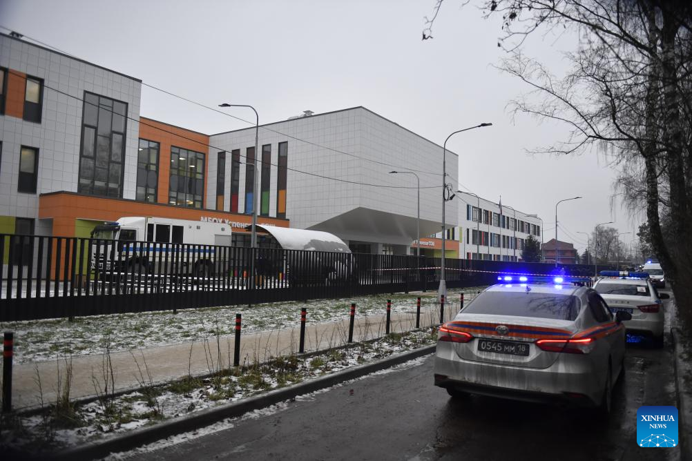 This photo taken on Dec. 16, 2025 shows the site of a school stabbing in Moscow, Russia. A student was fatally stabbed by a minor, who also wounded a security guard, at an educational institution in the Moscow region early Tuesday, the Russian Investigative Committee said. The incident occurred at the Gorki-2 settlement in the western district of Odintsovsky, the committee said, adding that a criminal case has been initiated. (Photo by Alexander Zemlianichenko Jr/Xinhua)