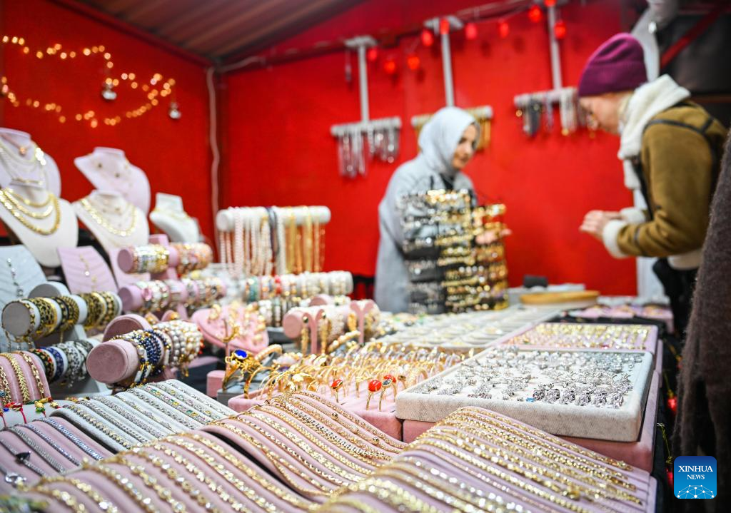 A New Year Shopping Festival is held at the Clock Tower Square of Galataport in Istanbul, Türkiye, Dec. 17, 2025. As the New Year approaches, tents have been set up at Clock Tower Square in Galataport for a New Year Shopping Festival, offering a variety of festive-themed goods. (Xinhua/Liu Lei)