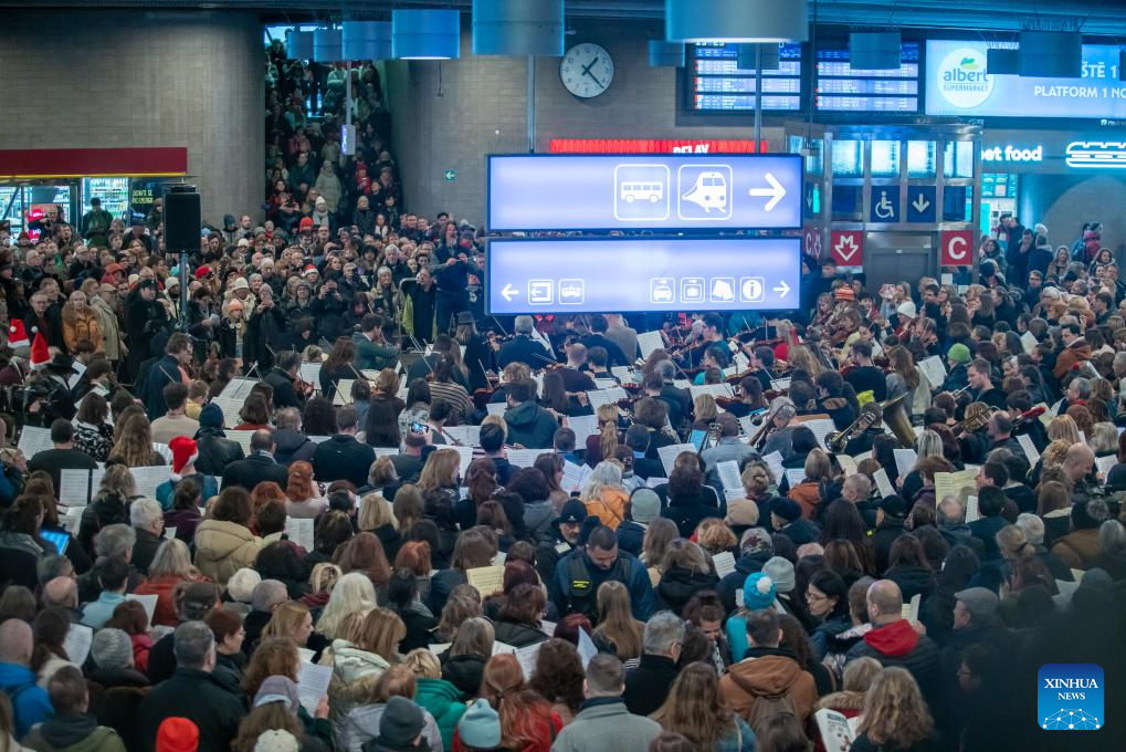 Musicians perform at Prague Main Railway Station in Prague, the Czech Republic, Dec. 23, 2025. Musicians gathered at Prague Main Railway Station on Tuesday to welcome Christmas through music, a tradition dating back to 2001. (Photo by Dana Kesnerova/Xinhua)