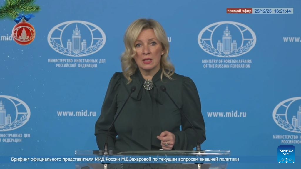 This video screenshot shows Russian Foreign Ministry Spokesperson Maria Zakharova speaking at a press briefing in Moscow, Russia, Dec. 25, 2025. Russia on Thursday condemned Japan's attempts to whitewash its history of militarist aggression and war crimes, urging Tokyo to face up to its past and make genuine atonement to the victims. Zakharova said that Japan ought to construct a memorial hall dedicated to the victims of Japanese militarism, and should "dispatch representatives to lay tributes there every year, or even more frequently, as a way to atone for the crimes it has committed." (Xinhua)