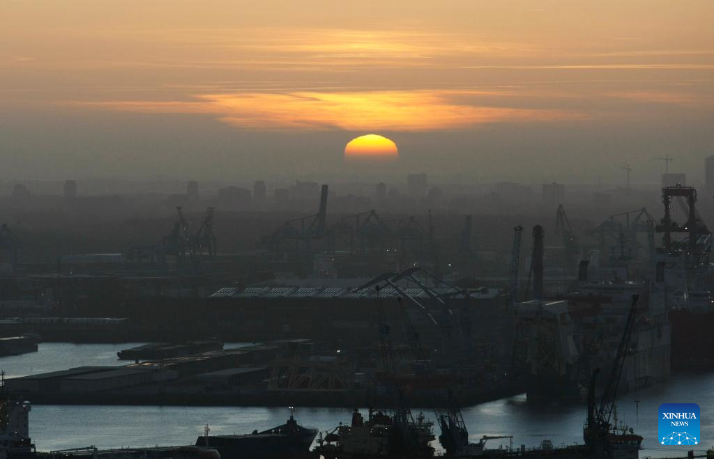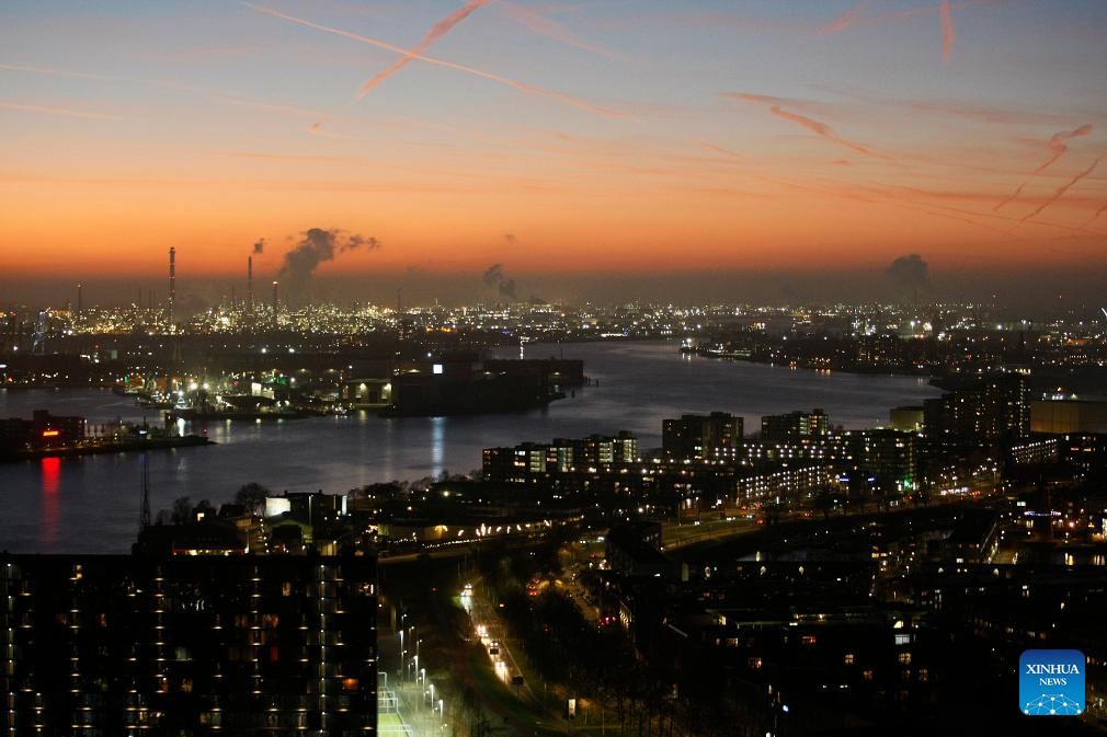 This photo taken from Rotterdam's Euromast on Dec. 28, 2025 shows the view at sunset in Rotterdam, the Netherlands. (Xinhua/Shao Haijun)
