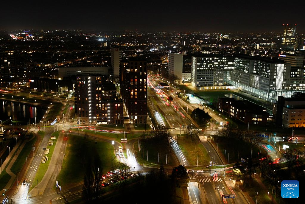 This photo taken from Rotterdam's Euromast on Dec. 28, 2025 shows the night city view of Rotterdam, the Netherlands. (Xinhua/Shao Haijun)