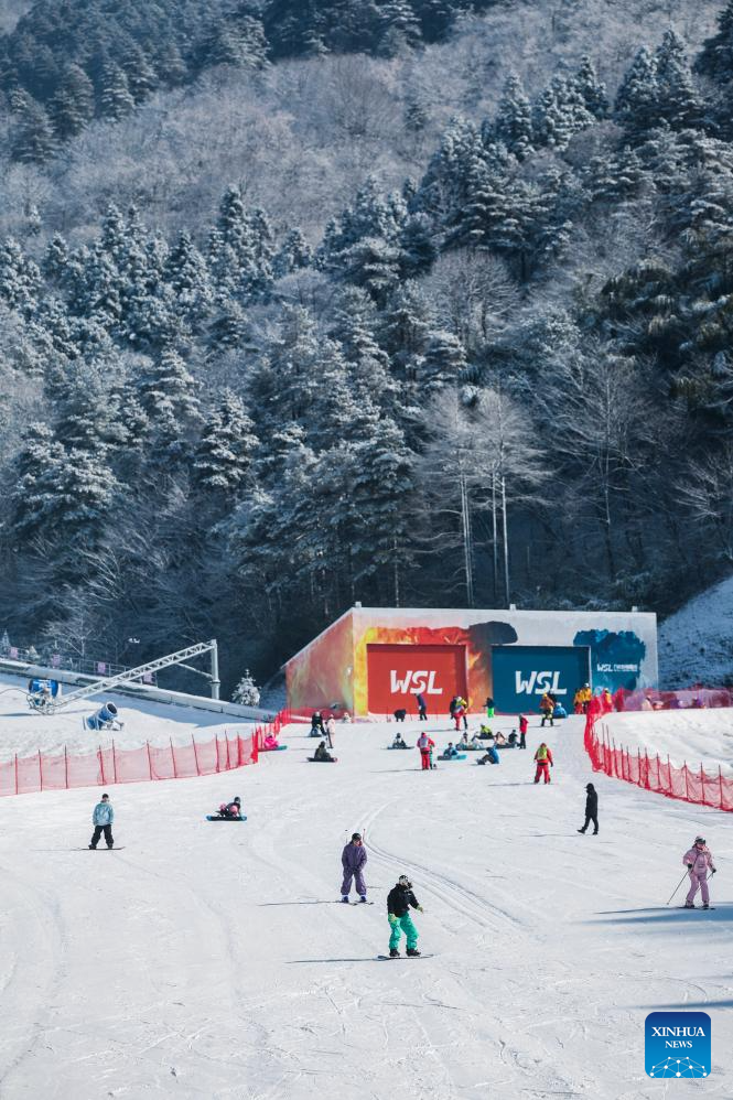 Tourists have fun at the SkyLand ski resort in Anji County of Huzhou City, east China's Zhejiang Province on Dec. 28, 2025. Skiing and a variety of other winter sports have become a popular seasonal pastime for a growing number of people in Zhejiang Province. The province boasts many ice and snow resorts, both indoor and outdoor, providing ample choices for enthusiasts. Notable examples include the Wansongling Ski Resort in Hangzhou, Qiaobo Ice and Snow World in Shaoxing, Taihu Lake Longemont Paradise in Huzhou, SkyLand ski resort in Anji, and Pan'an ski Resort in Jinhua. Moreover, such facilities are increasingly taking root across the province.