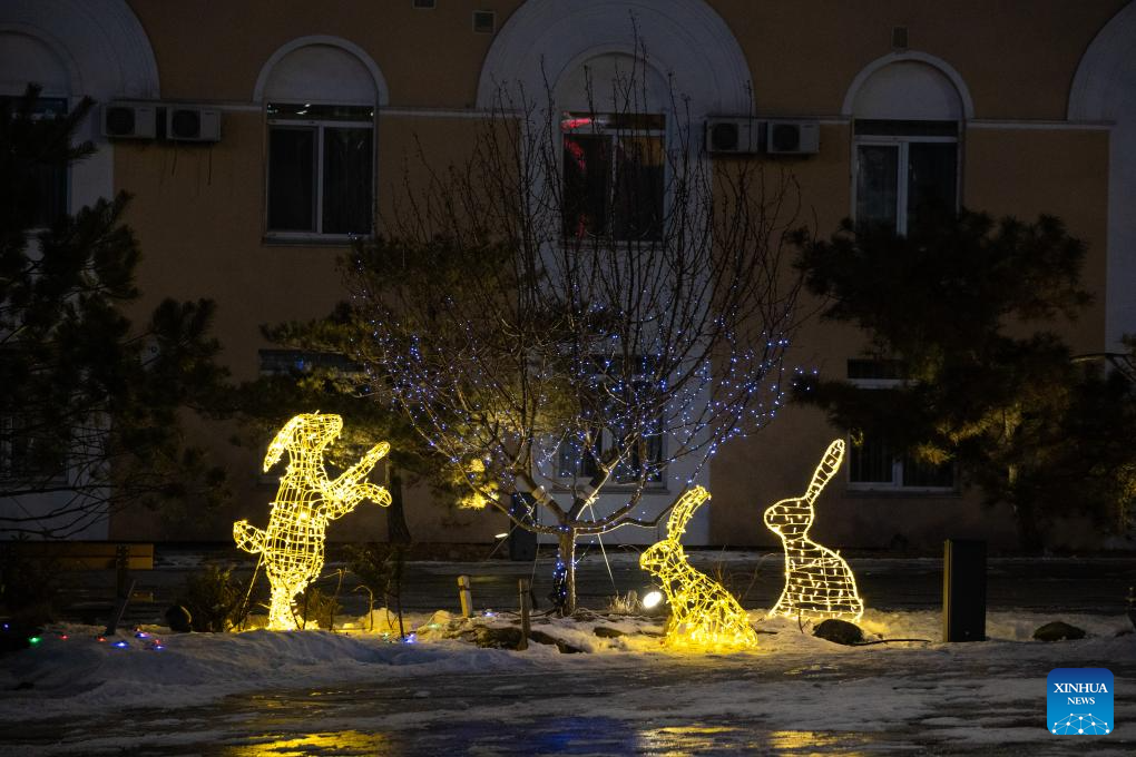 This photo taken on Dec. 29, 2025 shows New Year's lighting installations at a pedestrian street in Russian Far East city of Vladivostok. (Photo by Andrey Matveenko/Xinhua)