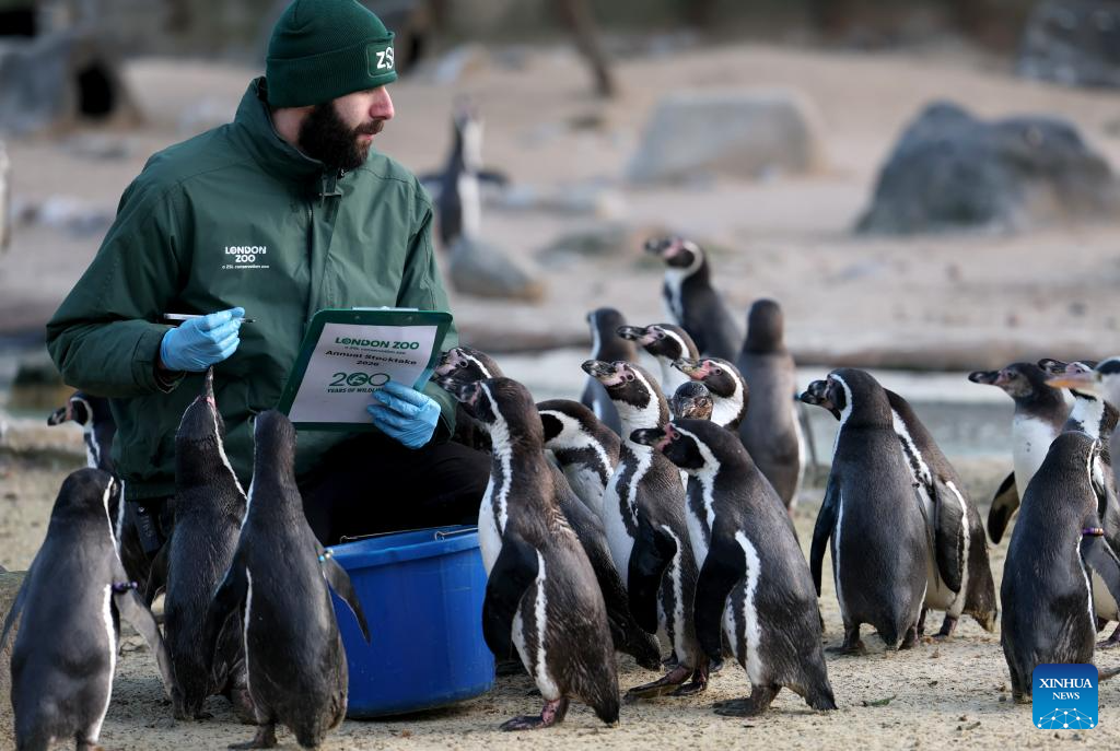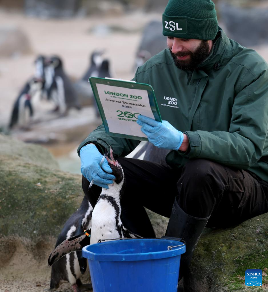 A zookeeper counts penguins during the annual stocktake at London Zoo in London, Britain, Jan. 6, 2026. (Xinhua/Li Ying)
