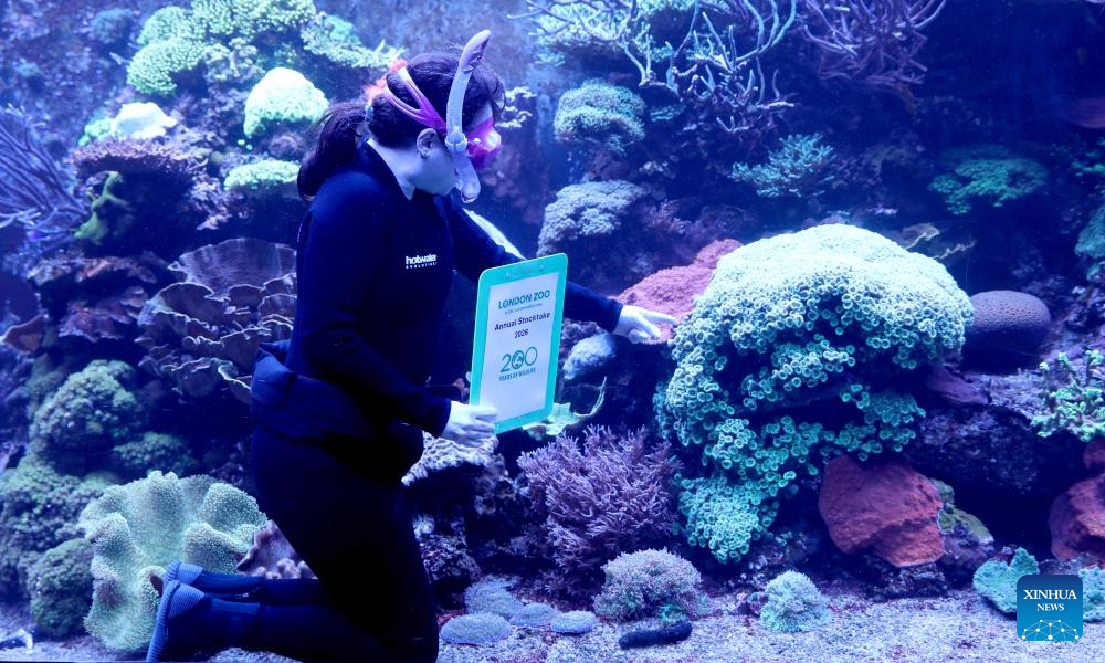 A staff member checks on the coral reef aquarium during the annual stocktake at London Zoo in London, Britain, Jan. 6, 2026. (Xinhua/Li Ying)