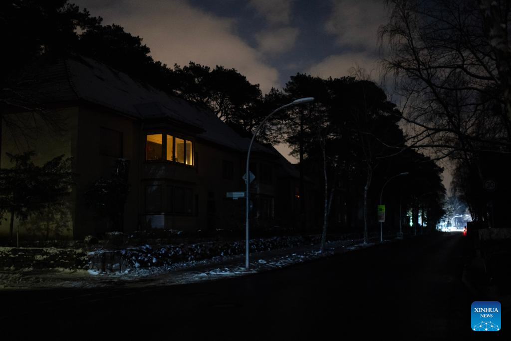 Photo taken on Jan. 6, 2026 shows a street view during a power outage at Nikolassee area in Berlin, Germany. Thousands of households, as well as supermarkets, shops, restaurants and other businesses in southwest Berlin, still remained without power on Tuesday, as crew continued repairs to restore electricity after an attack on the grid left parts of the German capital in the dark for a fourth consecutive day. (Xinhua/Zhang Haofu)