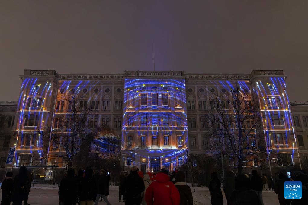 People enjoy a light show at the light festival in Helsinki, Finland, on Jan. 6, 2026. (Photo by Matti Matikainen/Xinhua)