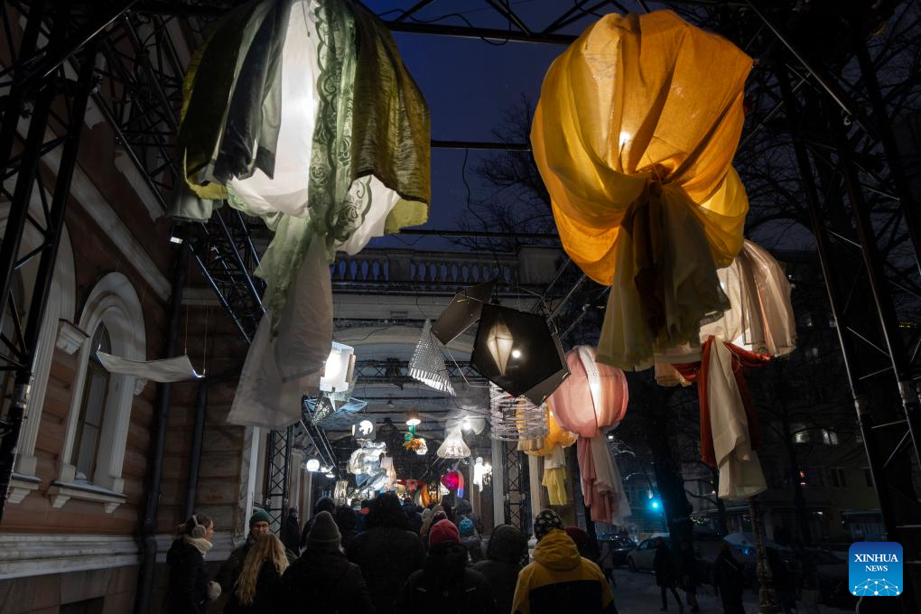 People walk through light installations at the light festival in Helsinki, Finland, on Jan. 6, 2026. (Photo by Matti Matikainen/Xinhua)