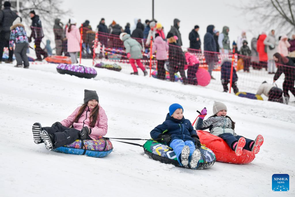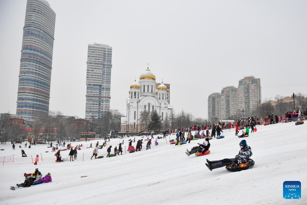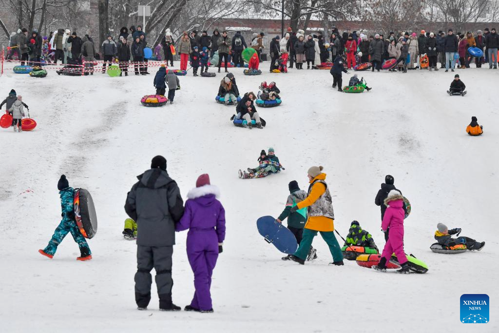 People enjoy sledding in the snow at a park in Moscow, Russia, on Jan. 7, 2026. (Photo by Alexander Zemlianichenko Jr/Xinhua)
