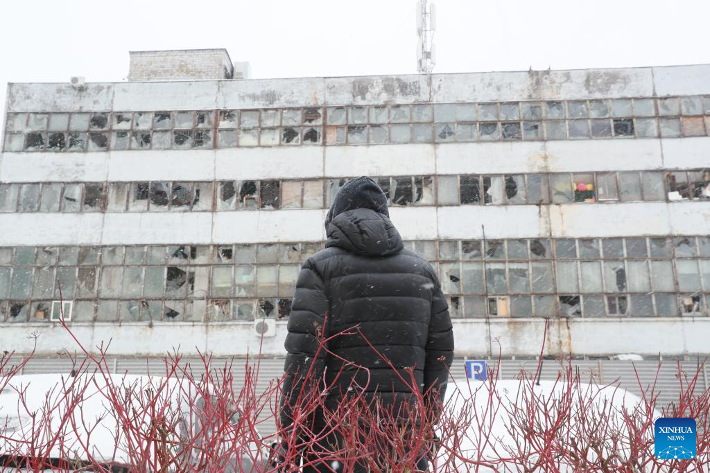 A man looks at a damaged residential building after a massive drone and missile attack by Russia, in Kiev, Ukraine, Jan. 9, 2026. Russia launched a massive drone and missile attack on Ukraine overnight Friday, killing at least four people and injuring 25 others in Kiev, authorities said. (Xinhua/Li Dongxu)
