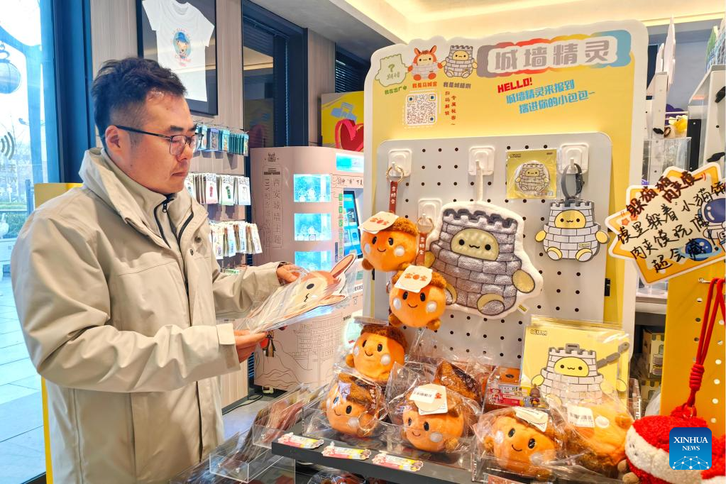 Zhao Bin looks at cultural and creative products at a cultural and creative store of the Xi'an City Wall in Xi'an, northwest China's Shaanxi Province, Jan. 4, 2026. (Xinhua)