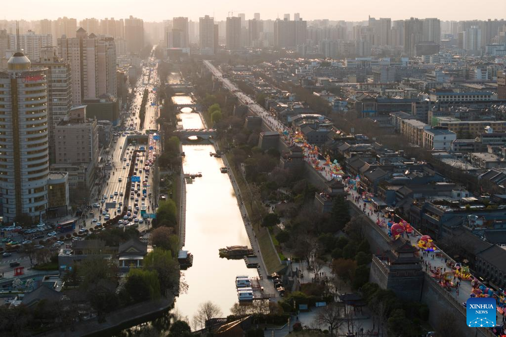 An aerial drone photo taken on March 19, 2025 shows the Xi'an City Wall and the moat in Xi'an, northwest China's Shaanxi Province. (Xinhua/Shao Rui)