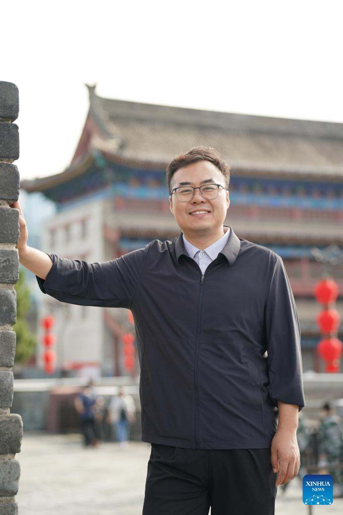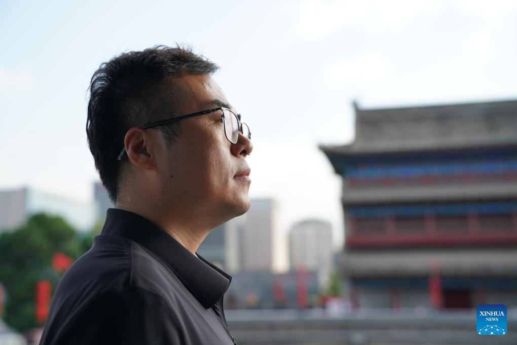 Zhao Bin is pictured on the Yongning Gate of the Xi'an City Wall in Xi'an, northwest China's Shaanxi Province, Sept. 12, 2025. (Xinhua/Shao Rui)