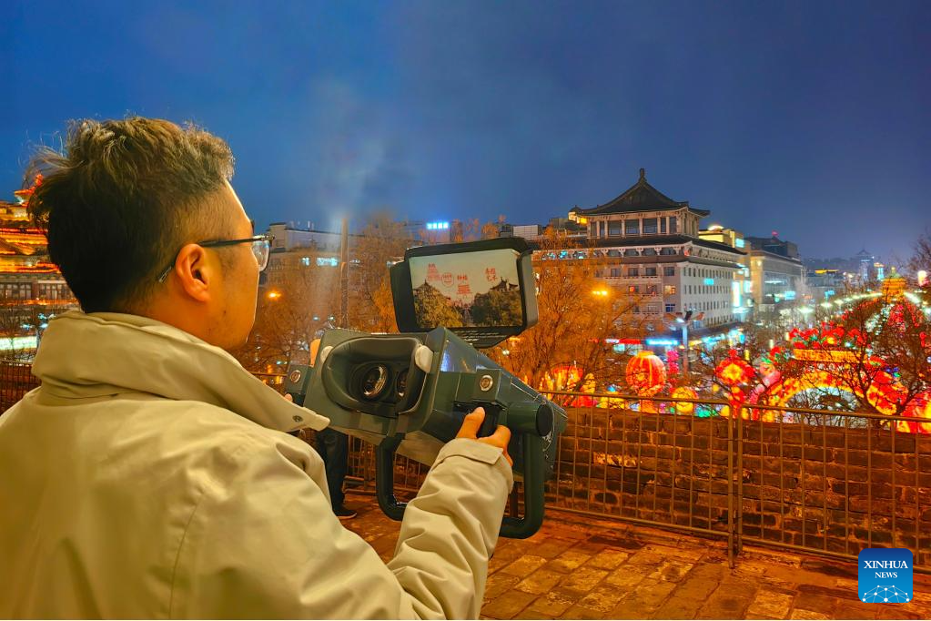Zhao Bin tests an AR telescope equipment on the Xi'an City Wall in Xi'an, northwest China's Shaanxi Province, Jan. 4, 2026.