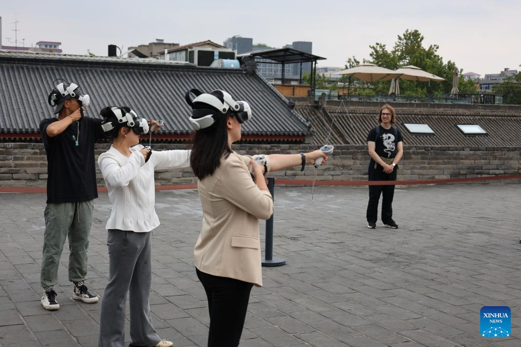 Tourists try a mixed-reality game themed on city protection on the Xi'an City Wall in Xi'an, northwest China's Shaanxi Province, Sept. 10, 2025. (Xinhua/Zhu Weixi)