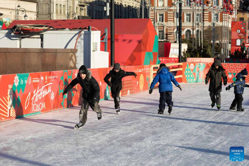 People skate on an ice rink in Vladivostok, Russia, Jan. 8, 2026. Russia's New Year holiday in 2026 will last till Jan. 11. (Photo by Andrey Matveenko/Xinhua)