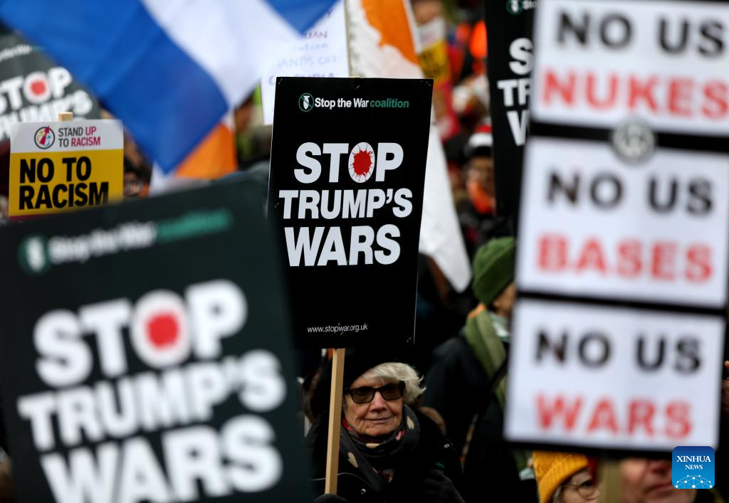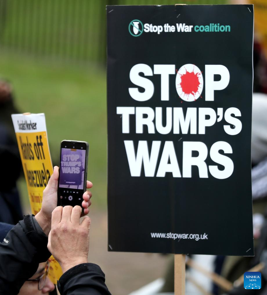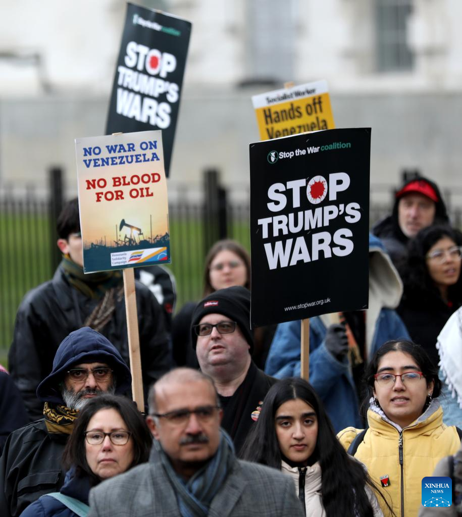 Demonstrators hold placards during a protest condemning U.S. attack on Venezuela outside No. 10 Downing Street in London, Britain, Jan. 10, 2026. (Xinhua/Li Ying)