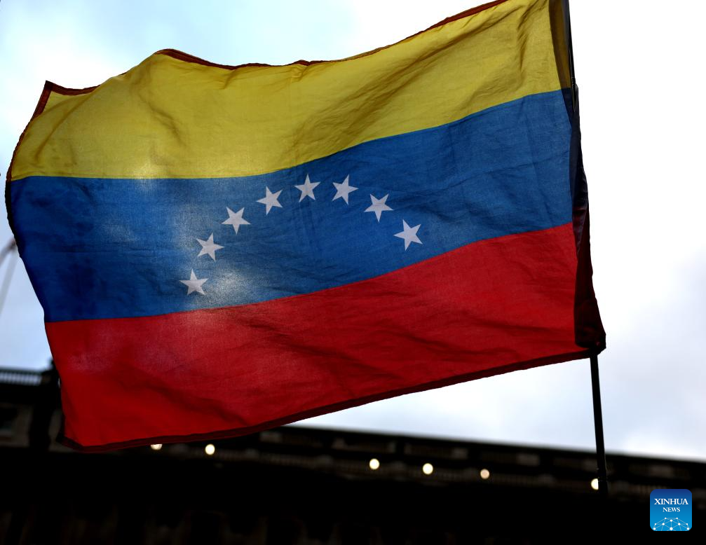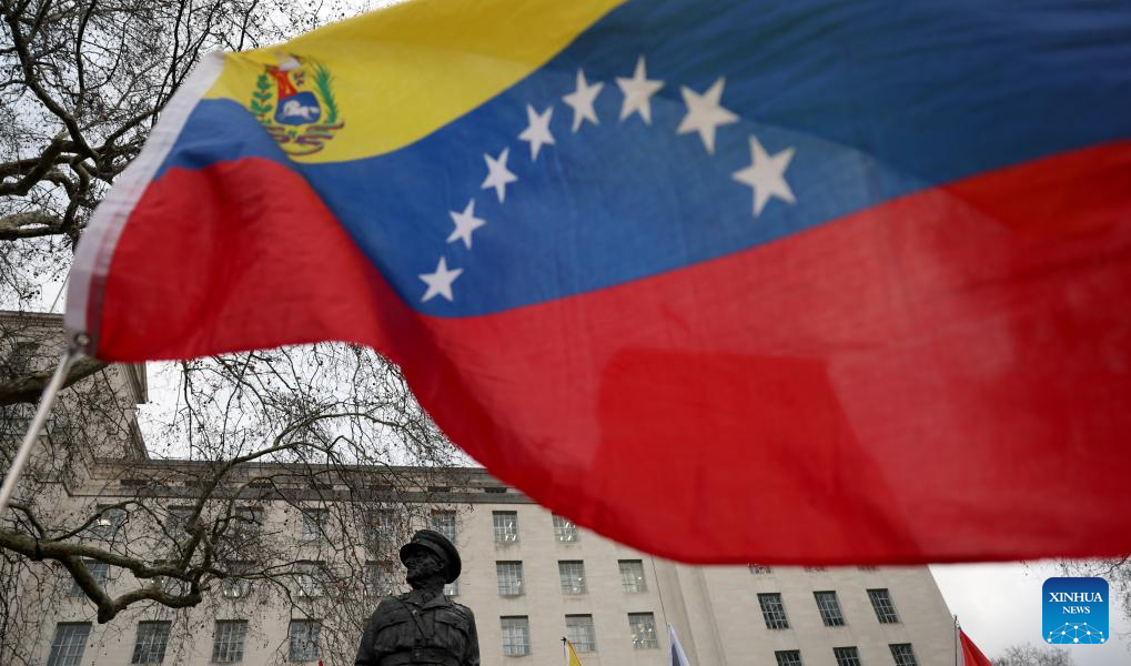A demonstrator waves Venezuelan national flag during a protest condemning U.S. attack on Venezuela outside No. 10 Downing Street in London, Britain, Jan. 10, 2026. (Xinhua/Li Ying)