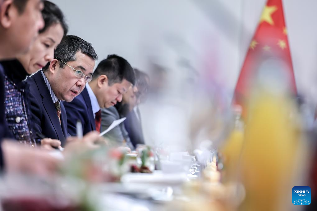 Chinese Ambassador to Hungary Gong Tao (3rd L) sepaks during a breakfast meeting in Budapest, Hungary, on Jan. 13, 2026. Hungarian Minister of Justice Bence Tuzson on Tuesday praised the contributions of Chinese enterprises to Hungary's economic and social development. (Photo by David Balogh/Xinhua)
