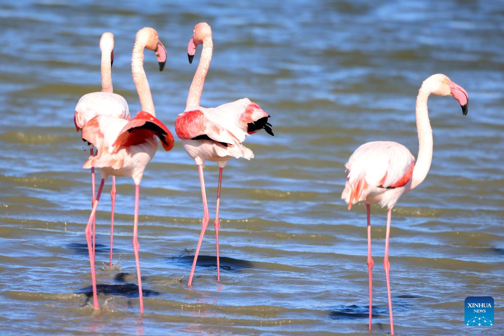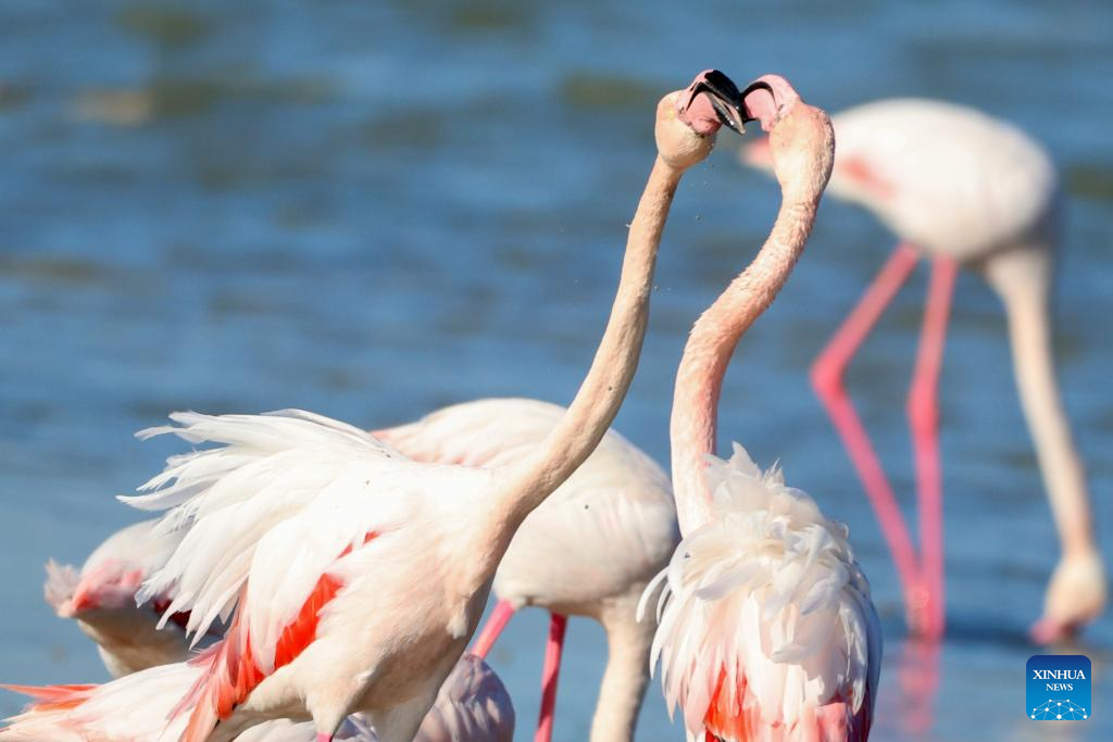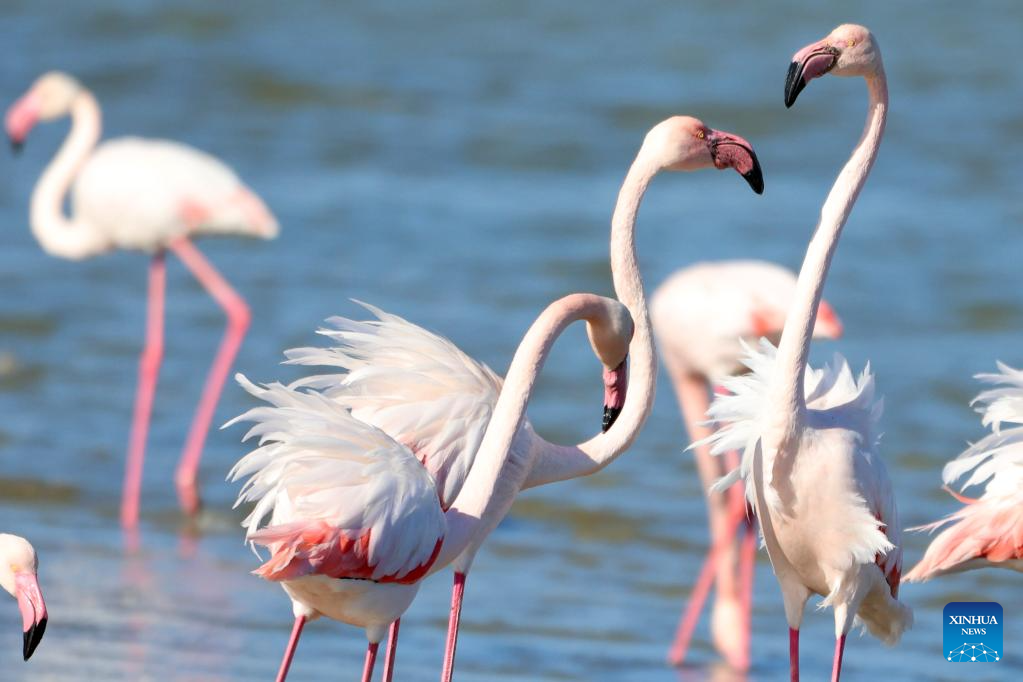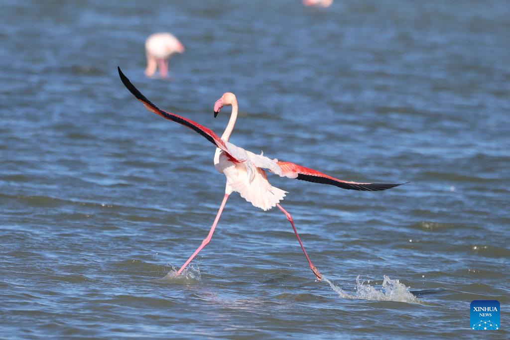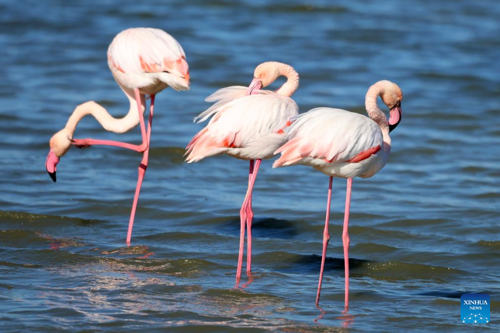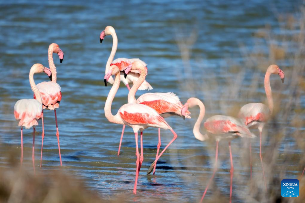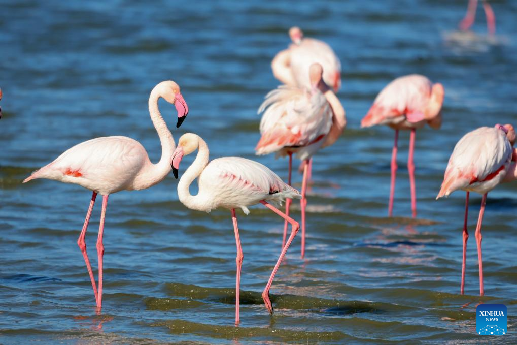 Flamingos are seen in Meneou Lake in Larnaca region, Cyprus, on Jan. 14, 2026. The migratory birds, which winter in Cyprus' wetlands including lakes in the Larnaca region, are part of the Eastern Mediterranean's key waterbird populations. (Photo by George Christophorou/Xinhua)