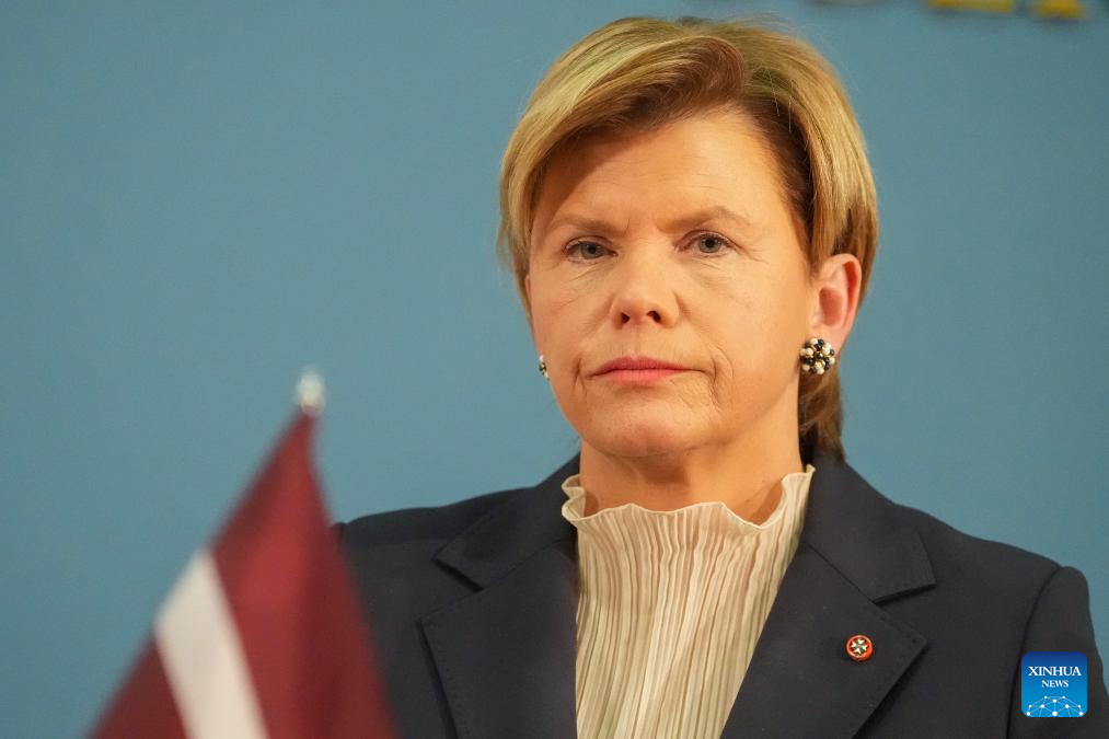 Latvian Foreign Minister Baiba Braze is pictured during a joint press conference with visiting French Foreign Minister Jean-Noel Barrot (not in the picture) in Riga, Latvia, Jan. 15, 2026. Europeans are fully capable of defending their territory against any threat, French Foreign Minister Jean-Noel Barrot said here on Thursday, stressing that Greenland is a European territory whose security is inseparable from that of Europe.