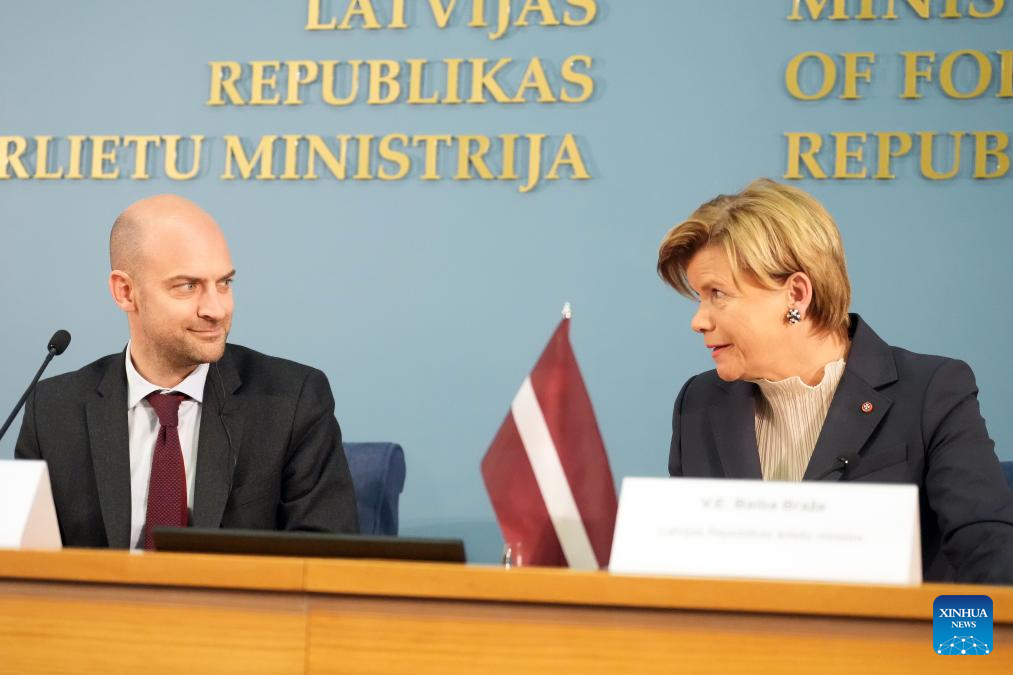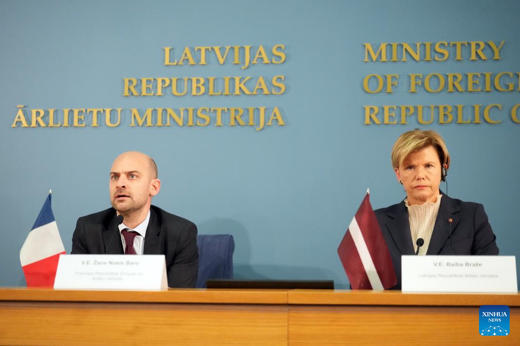 Latvian Foreign Minister Baiba Braze (R) and visiting French Foreign Minister Jean-Noel Barrot interact while attending a joint press conference in Riga, Latvia, Jan. 15, 2026. Europeans are fully capable of defending their territory against any threat, French Foreign Minister Jean-Noel Barrot said here on Thursday, stressing that Greenland is a European territory whose security is inseparable from that of Europe.