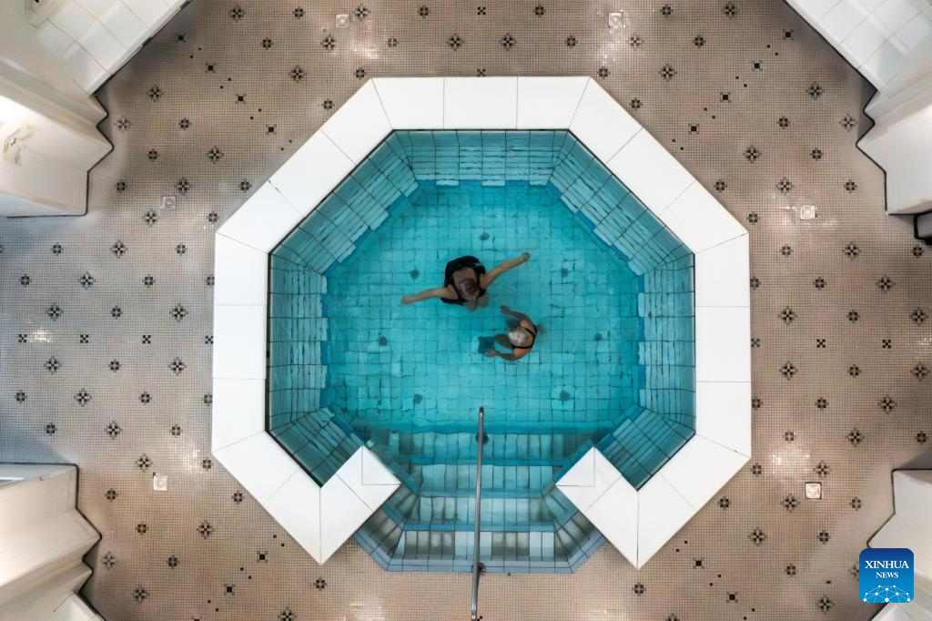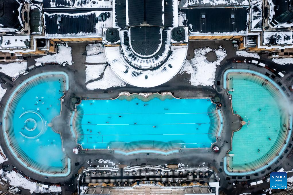 An aerial drone photo shows visitors enjoying a thermal bath in the open air pool at the Szechenyi Thermal Bath in Budapest, Hungary, Jan. 16, 2026. (Photo by David Balogh/Xinhua)