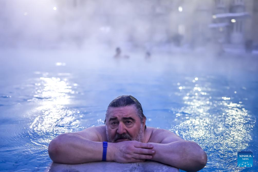 A man enjoys a thermal bath in the open air pool at the Szechenyi Thermal Bath in Budapest, Hungary on Jan. 16, 2026. (Photo by David Balogh/Xinhua)