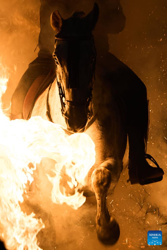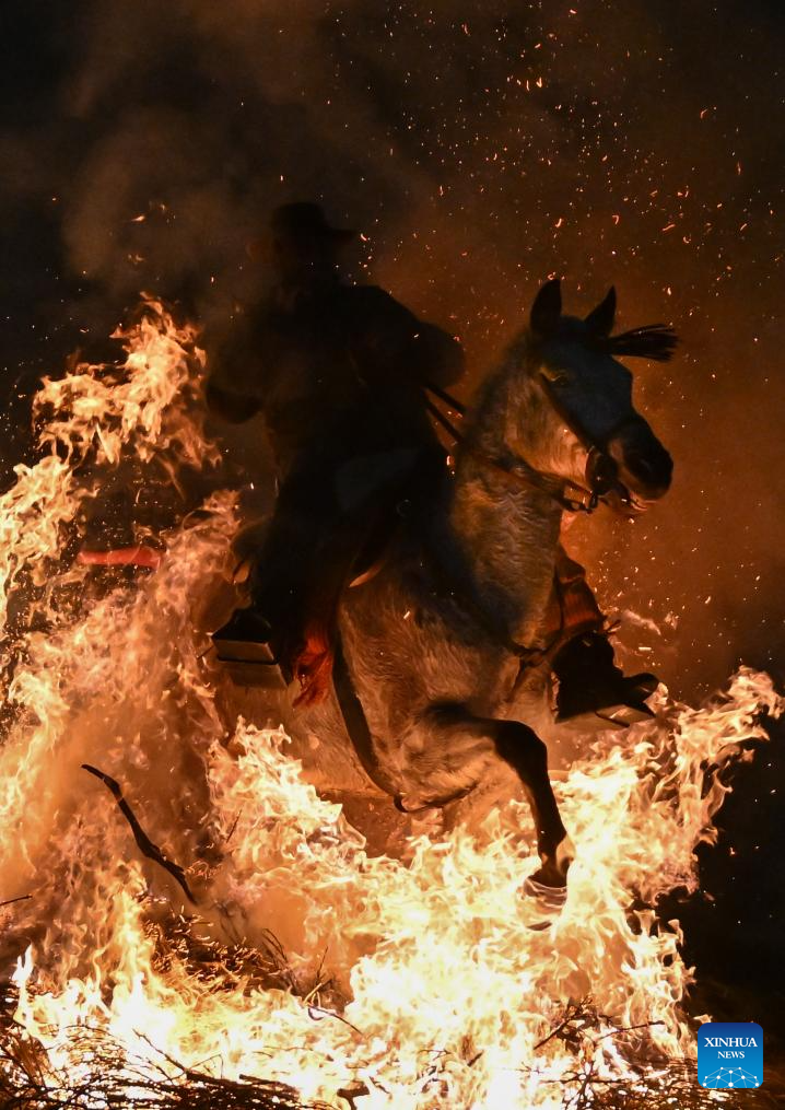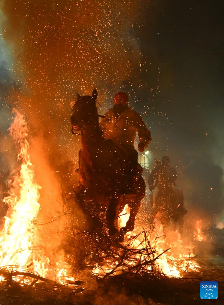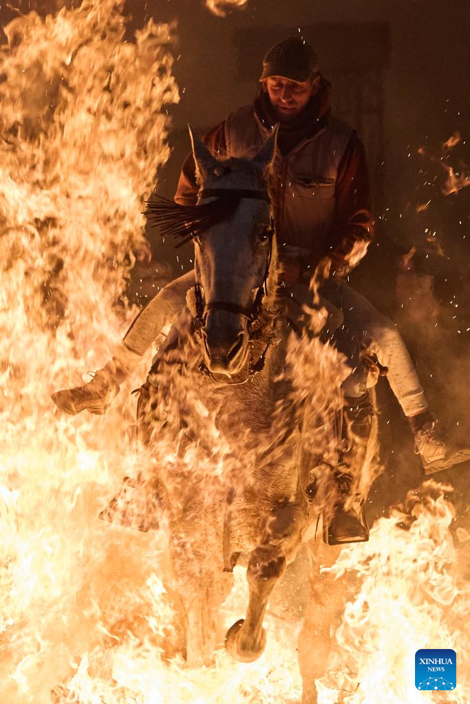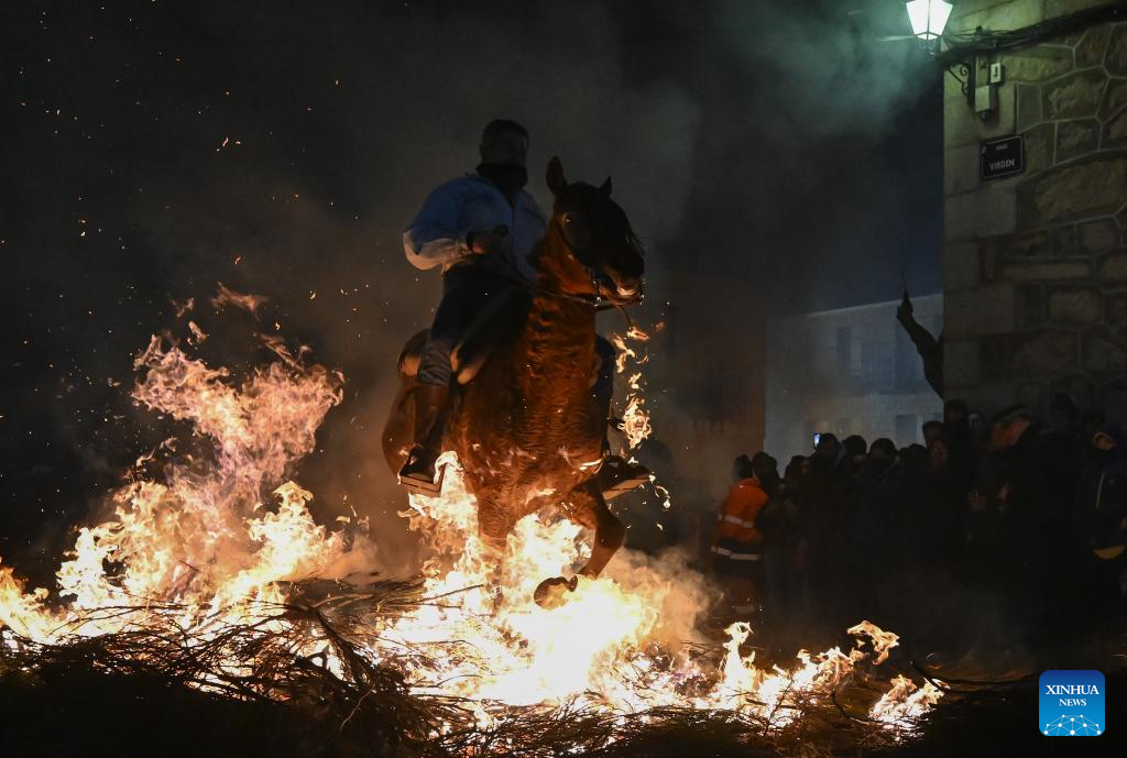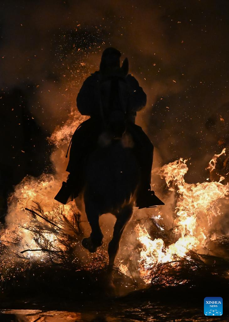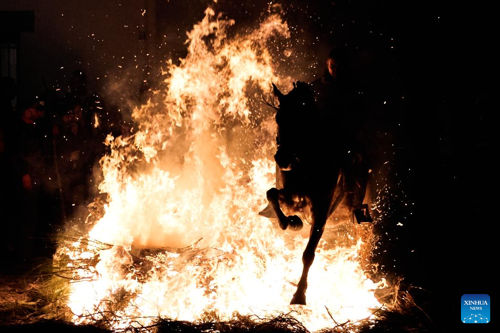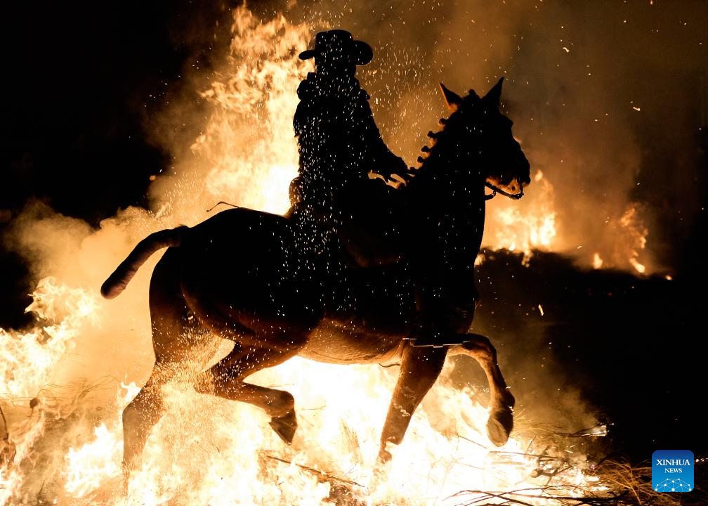 A rider rides a horse through a bonfire during the opening of the traditional religious festival "Las Luminarias" in the village of San Bartolome de Pinares in Avila, Spain, Jan. 16, 2026. (Xinhua/Cheng Min)