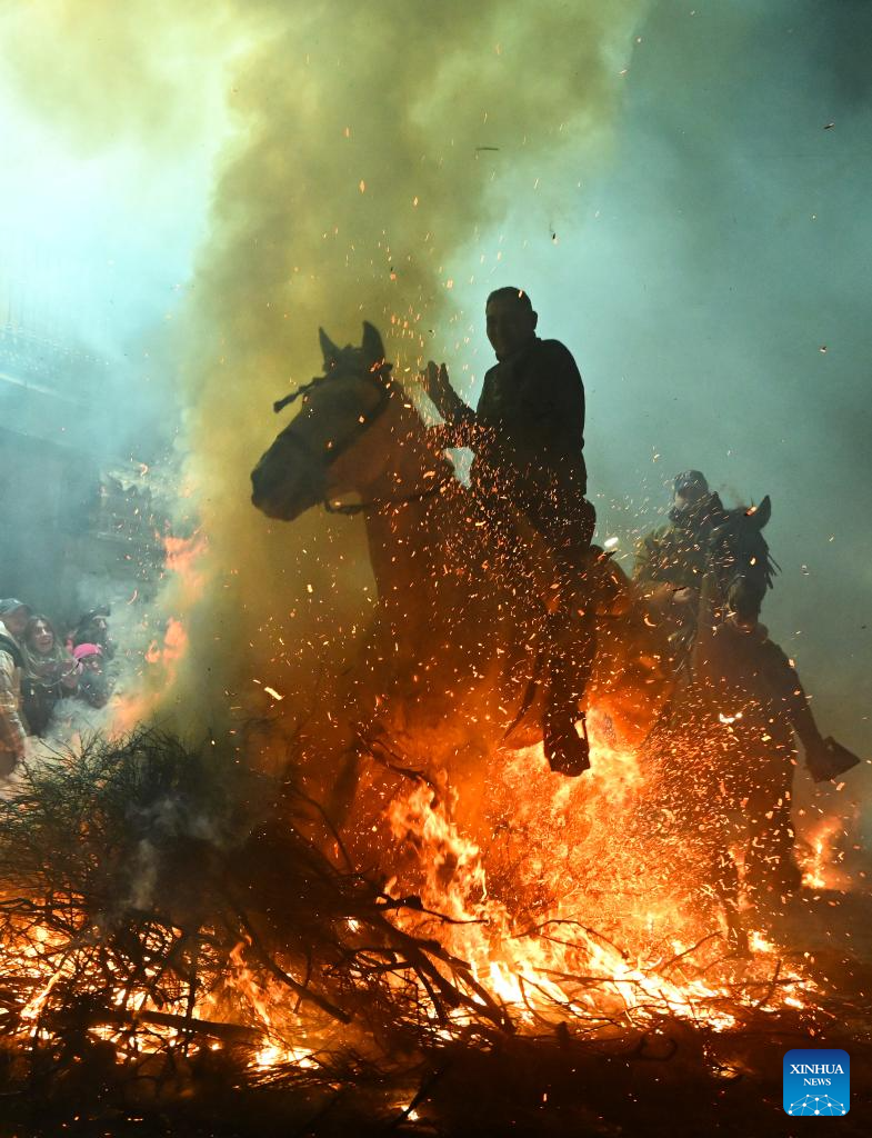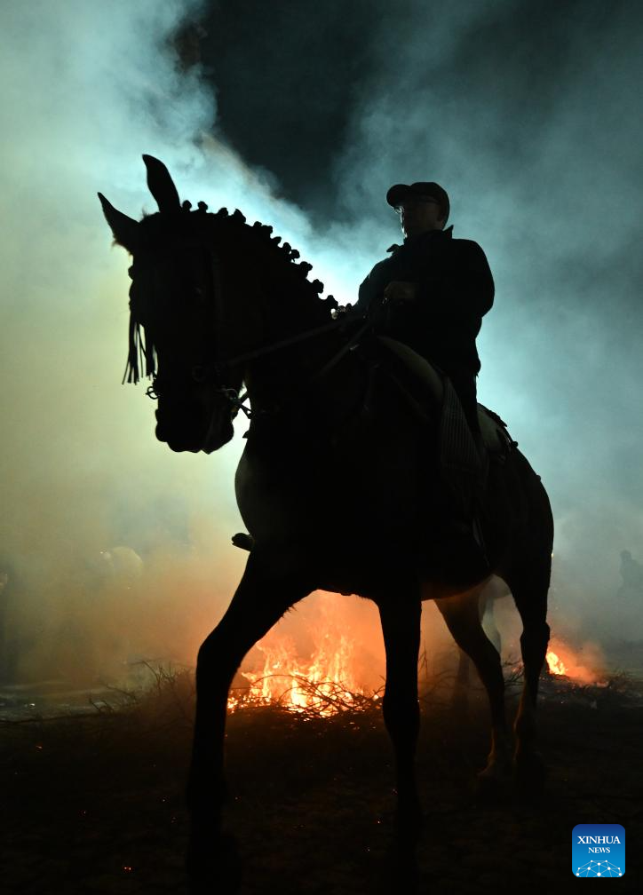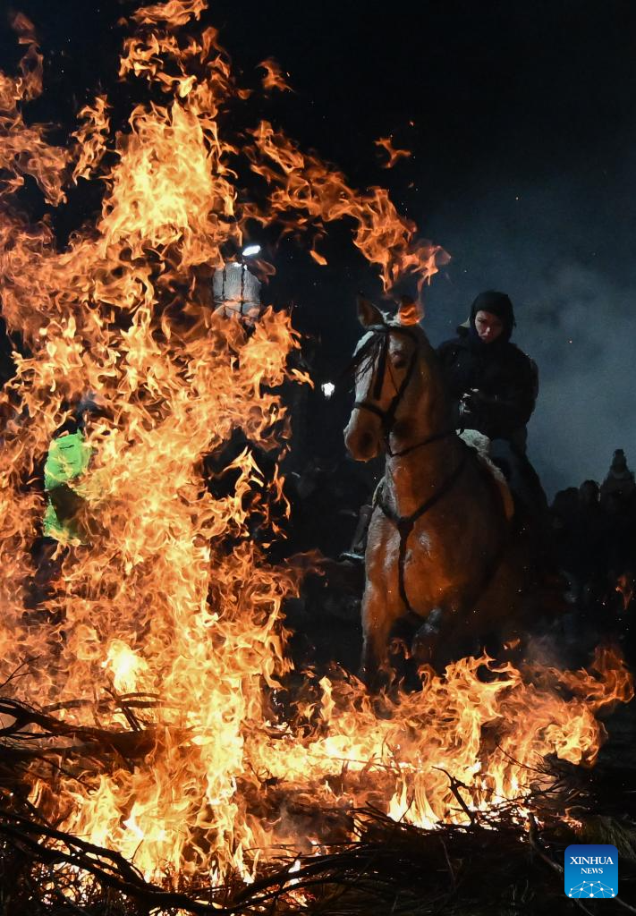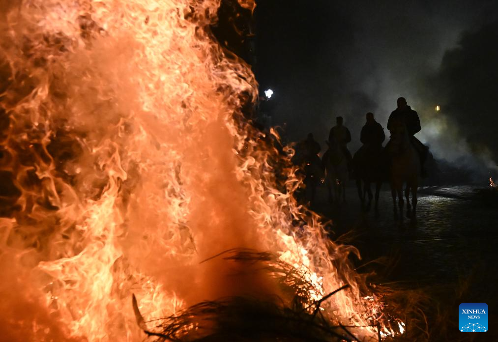 People ride horses through a bonfire during the opening of the traditional religious festival "Las Luminarias" in the village of San Bartolome de Pinares in Avila, Spain, Jan. 16, 2026. (Xinhua/Cheng Min)