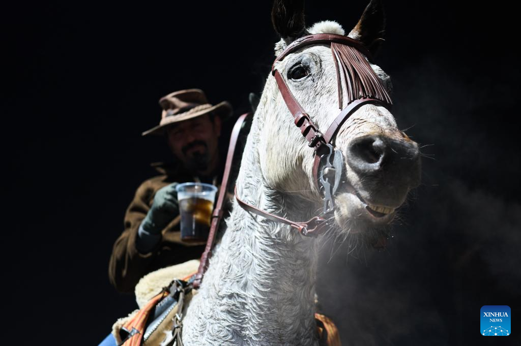 A horseman is seen with his horse during the opening of the traditional religious festival "Las Luminarias" in the village of San Bartolome de Pinares in Avila, Spain, Jan. 16, 2026. (Xinhua/Meng Dingbo)