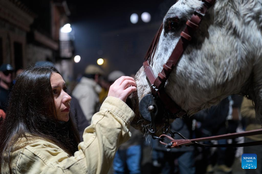 A woman touches a horse during the opening of the traditional religious festival "Las Luminarias" in the village of San Bartolome de Pinares in Avila, Spain, Jan. 16, 2026. (Xinhua/Meng Dingbo)
