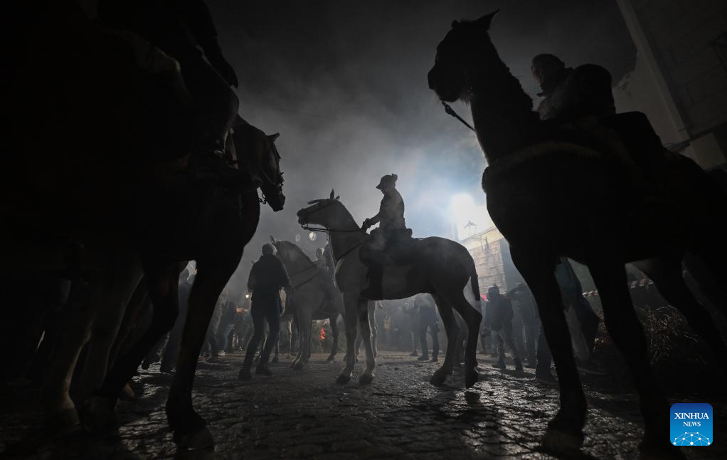 Horsemen are seen during the opening of the traditional religious festival "Las Luminarias" in the village of San Bartolome de Pinares in Avila, Spain, Jan. 16, 2026. (Xinhua/Cheng Min)