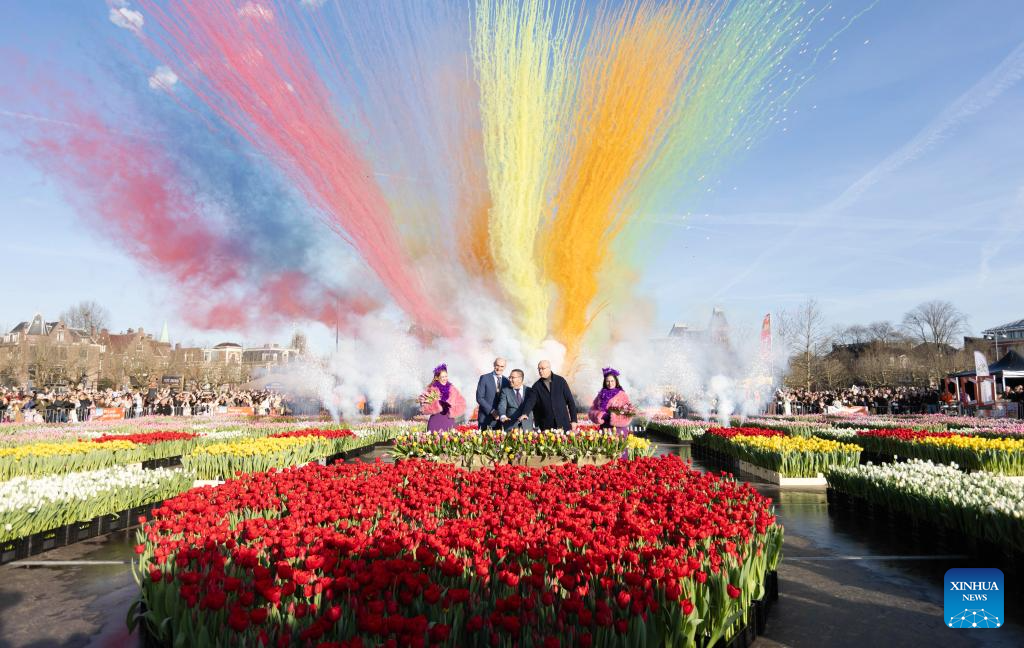 A firework show is staged at a huge picking garden with more than 200,000 tulips on the Museum Square in Amsterdam, the Netherlands, Jan. 17, 2026. The Dutch celebrated the annual National Tulip Day, which is traditionally marked on the third Saturday of the year. (Photo by Sylvia Lederer/Xinhua)