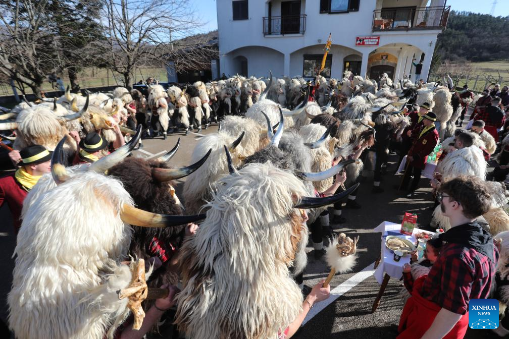 People in traditional costumes take part in the bell ringers' parade in Grobnik, Croatia, on Jan. 17, 2026. The event is a Croatian tradition to drive out evil spirits over the winter months and to usher in the start of spring. (Goran Kovacic/PIXSELL via Xinhua)