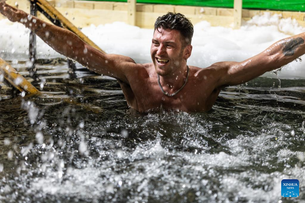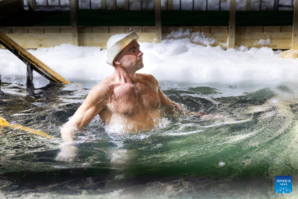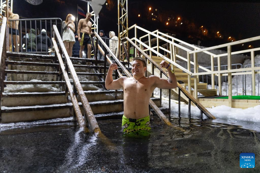 A man bathes in the icy water during the Orthodox Epiphany celebrations in Vladivostok, Russia, Jan. 18, 2026. (Photo by Andrey Matveenko/Xinhua)