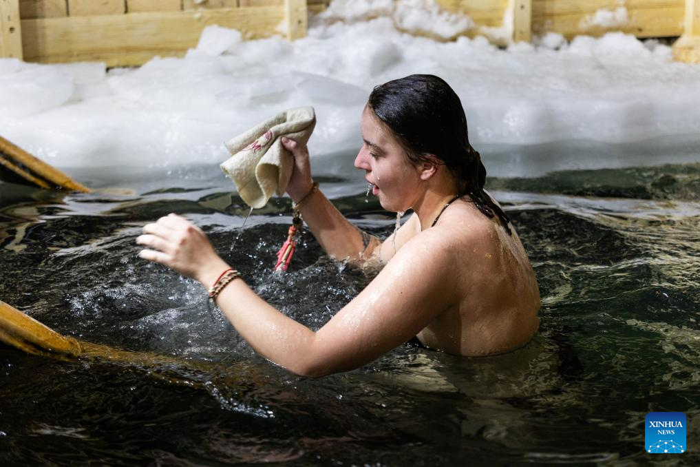 A woman bathes in the icy water during the Orthodox Epiphany celebrations in Vladivostok, Russia, Jan. 18, 2026. (Photo by Andrey Matveenko/Xinhua)