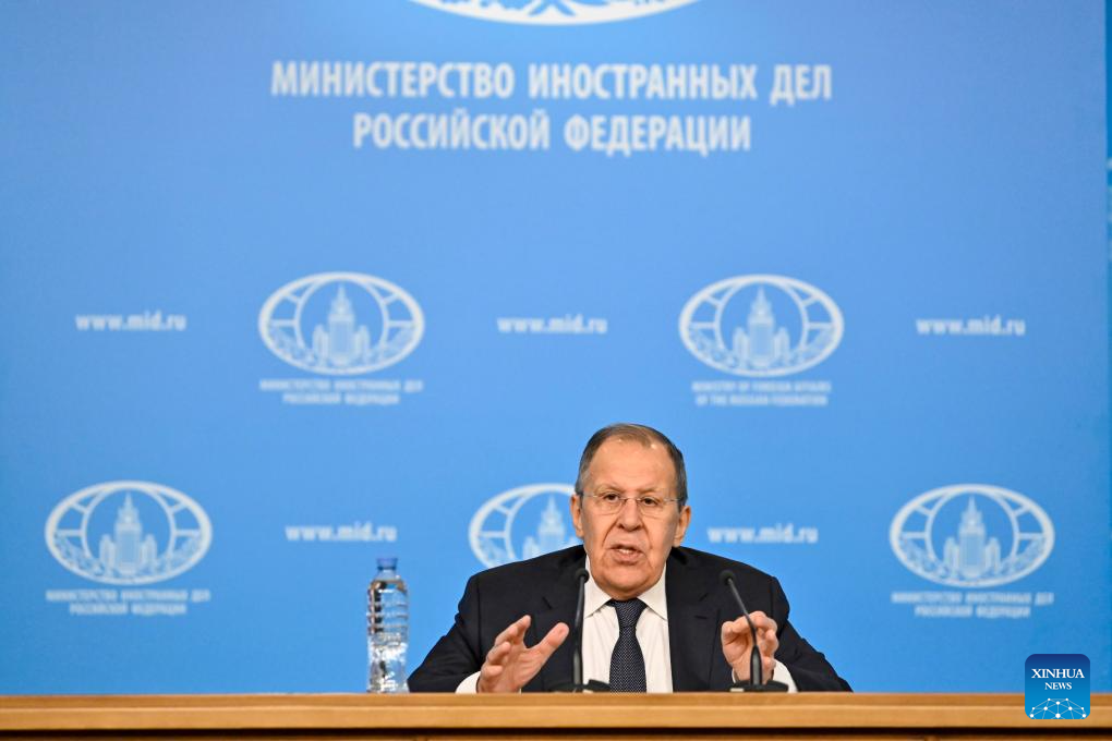 Russian Foreign Minister Sergei Lavrov (R) answers questions during his annual press conference in Moscow, Russia, Jan. 20, 2026. (Photo by Alexander Zemlianichenko Jr/Xinhua)
