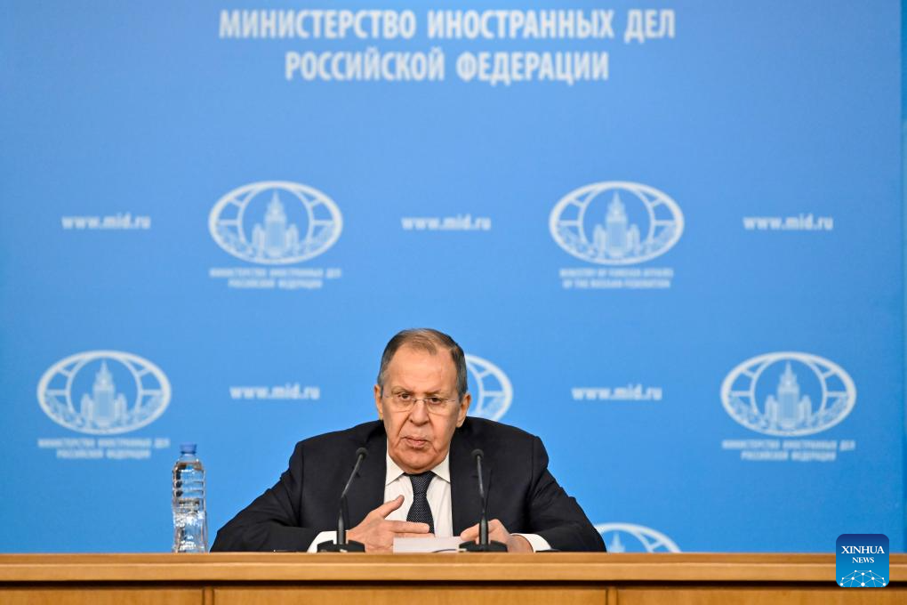 Russian Foreign Minister Sergei Lavrov answers questions during his annual press conference in Moscow, Russia, Jan. 20, 2026. (Photo by Alexander Zemlianichenko Jr/Xinhua)