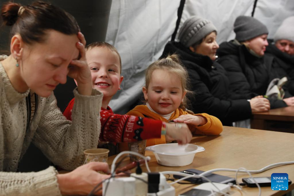 People stay warm and charge their electronic devices at a temporary shelter in Kiev, Ukraine, Jan. 20, 2026. Russia's air raids caused large-scale power and water supply disruptions in Ukraine's capital of Kiev on Tuesday, said Kiev Mayor Vitali Klitschko.