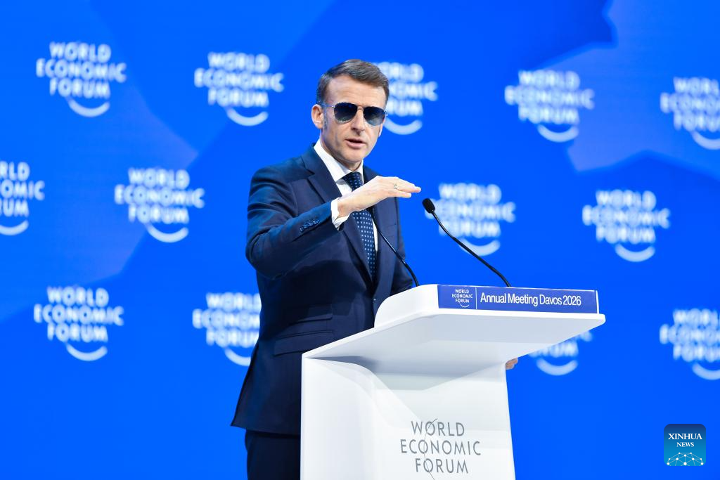French President Emmanuel Macron speaks at the World Economic Forum annual meeting in Davos, Switzerland, Jan. 20, 2026. (Xinhua/Lian Yi)
