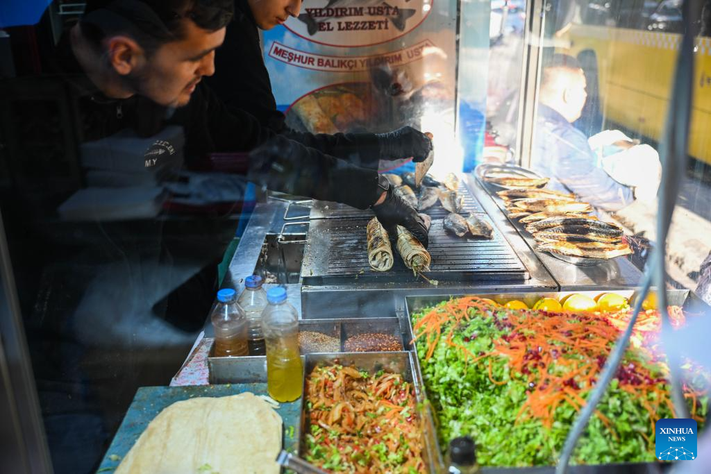 ISTANBUL, Jan. 22 (Xinhua) -- Around noon, a long line waits outside a tiny shop on a back street in Istanbul's historic Karakoy district. Inside, the rhythmic motion of knives stripping fish bones signals the preparation of the fish wrap, a beloved traditional street food.