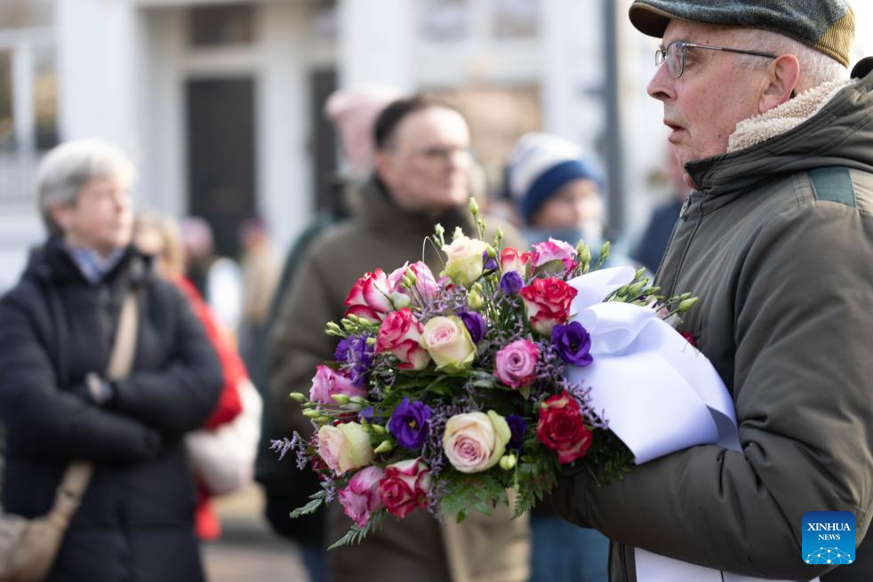 A man lays flowers during a commemoration ceremony on the occasion of the National Holocaust Remembrance Day in Wertheim Park in Amsterdam, the Netherlands, Jan. 25, 2026. The National Holocaust Remembrance Day is observed annually in the Netherlands on the last Sunday of January. (Photo by Sylvia Lederer/Xinhua)