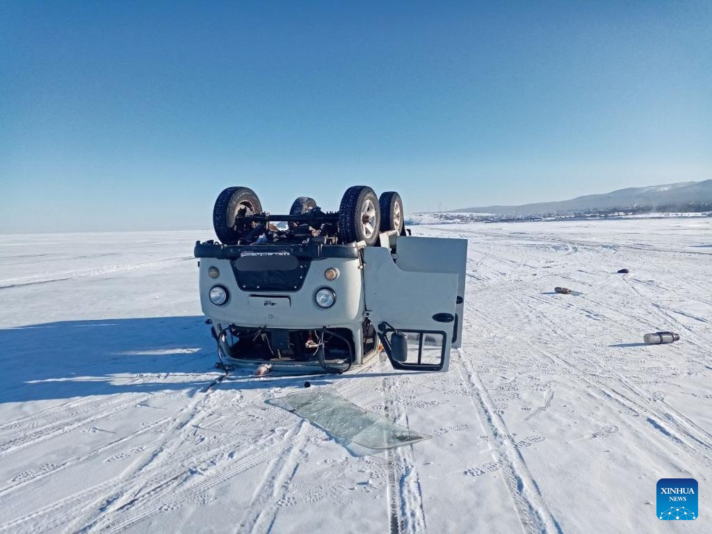 This photo taken on Jan. 28, 2026 shows an overturned car on the frozen surface of Lake Baikal in Russia. A Chinese tourist died after a car carrying tourists overturned on the frozen surface of Lake Baikal in Russia on Wednesday. (Xinhua)