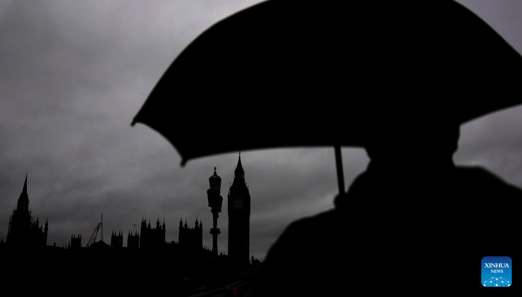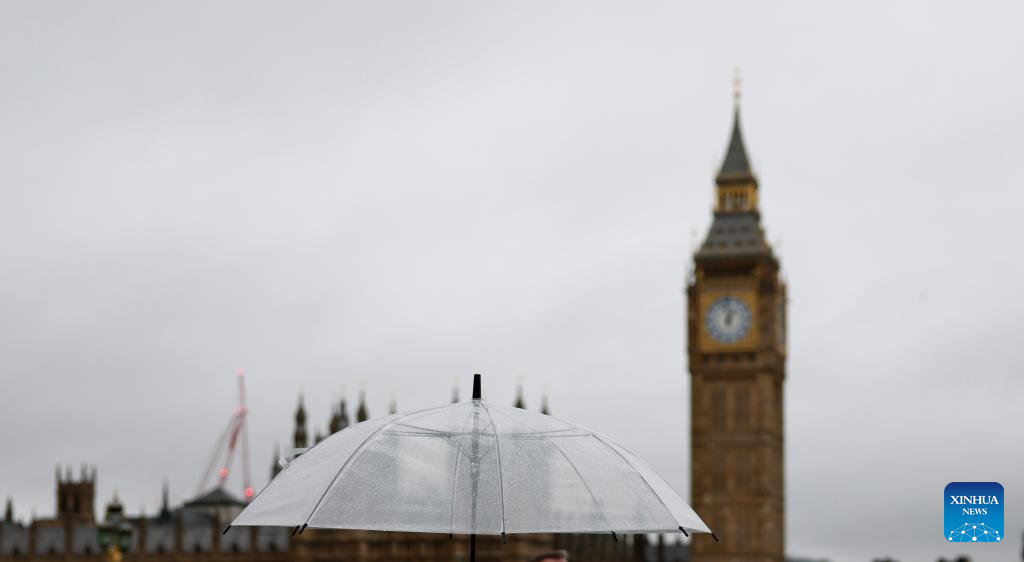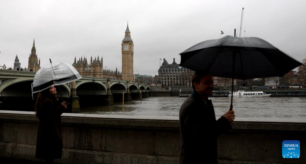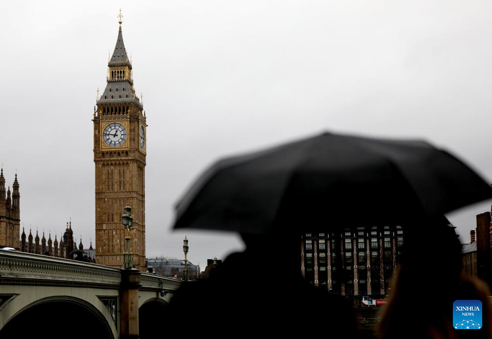 People walk with umbrellas near the Big Ben in London, Britain, Jan. 27, 2026, as Storm Chandra brings rain to much of the country. (Xinhua/Li Ying)