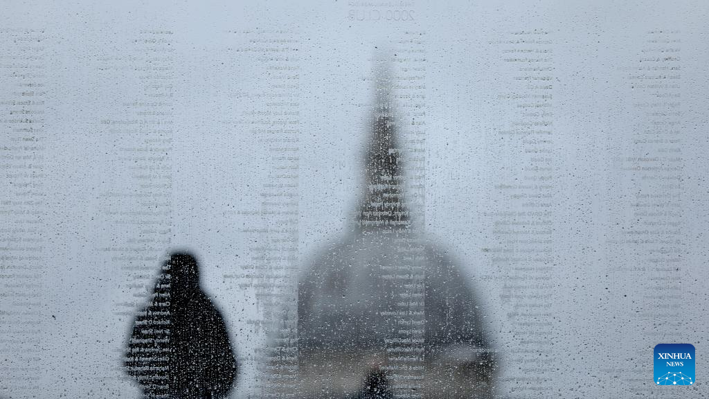 A reflection of St Paul's Cathedral and a pedestrian walking past is seen in a puddle in London, Britain, Jan. 27, 2026, as Storm Chandra brings rain to much of the country. (Xinhua/Li Ying)