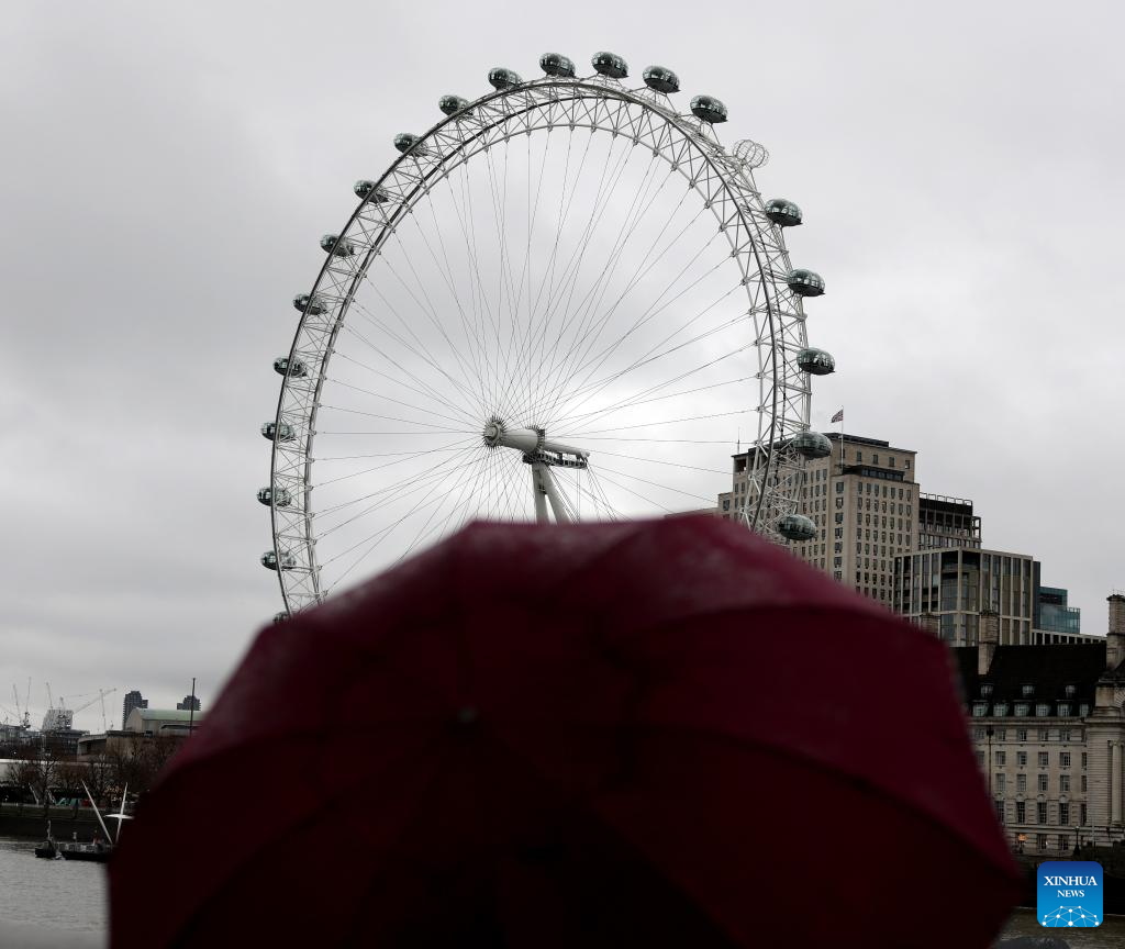 An umbrella is seen near the London Eye in London, Britain, Jan. 27, 2026, as Storm Chandra brings rain to much of the country. (Xinhua/Li Ying)