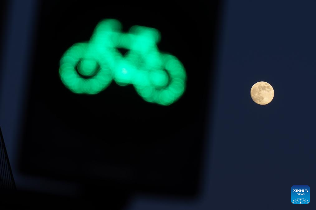 A bright moon is seen next to a green bicycle traffic light in Warsaw, Poland on Jan. 31, 2026. (Photo by Jaap Arriens/Xinhua)